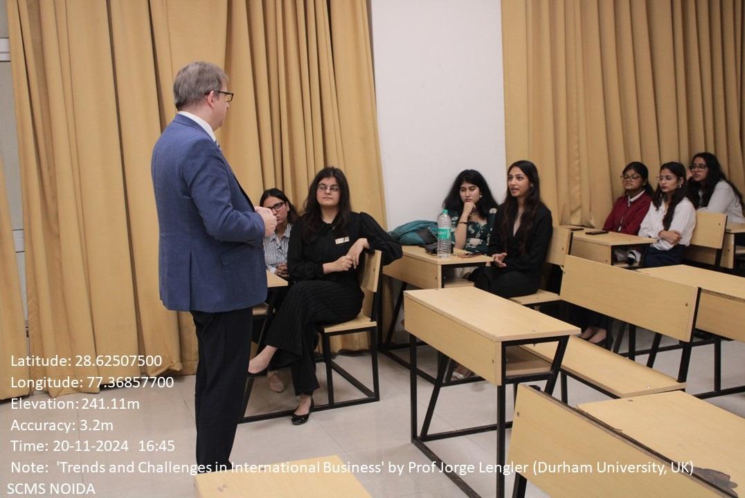 The International Cell of SCMS Noida organized a Global Talk series on the topic ‘Trends and Challenges in International Business,’ which took place on November 20th, 2024. The session was led by Professor Jorge Lengler, Professor of Management, and Associated Dean for Internationalism, Durham University Business School, United Kingdom.