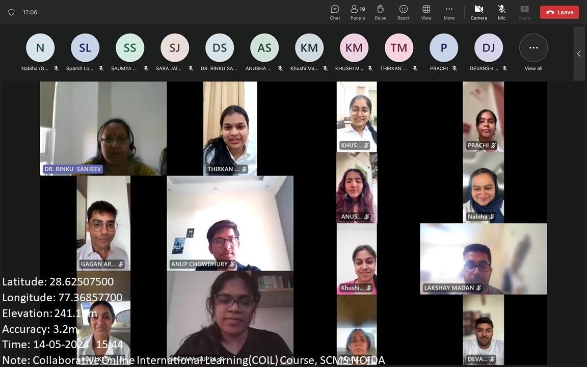 From 3rd March to 7th April 2025, SCMS NOIDA, in collaboration with Florida International University (USA) and SCMS Hyderabad, conducted a COIL course on “Cultural Message Implications from a Cross-Cultural Perspective.” Students explored how cultural differences shape messaging across borders through joint sessions, case studies, and collaborative projects. The course enhanced intercultural communication, critical thinking, and global awareness, culminating in presentations of culturally adaptive strategies.