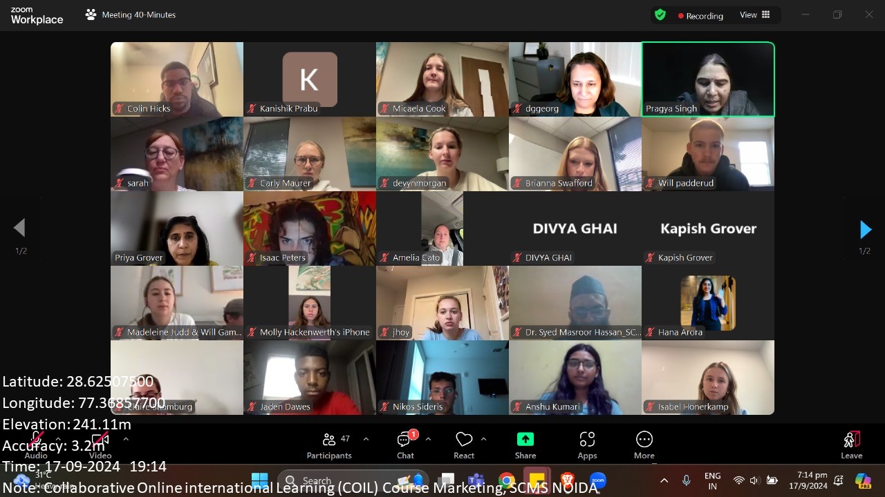 In the words of Nelson Mandela, 'Education is the most powerful weapon which you can use to change the world.' Building upon this ethos of transformative learning, SCMS NOIDA, in collaboration with Florida International University (FIU) and SCMS Hyderabad, orchestrated a pioneering Collaborative Online International Learning (COIL) course during the academic session 2023. From October 13 to November 3, 2023, the COIL module meticulously equipped students with the essential skills to thrive in culturally diverse business landscapes. Distinguished faculty members from SCMS Noida, FIU, and SCMS Hyderabad facilitated lectures and interactive sessions on International Marketing, International Human Resource Management (HRM), Cross-Cultural Management, Advertising, and Consumer Behavior.