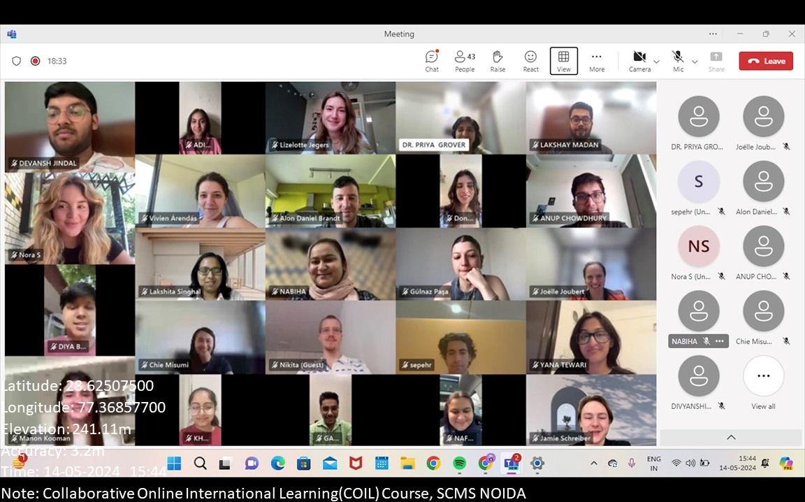 From 3rd March to 7th April 2025, SCMS NOIDA, in collaboration with Florida International University (USA) and SCMS Hyderabad, conducted a COIL course on “Cultural Message Implications from a Cross-Cultural Perspective.” Students explored how cultural differences shape messaging across borders through joint sessions, case studies, and collaborative projects. The course enhanced intercultural communication, critical thinking, and global awareness, culminating in presentations of culturally adaptive strategies.