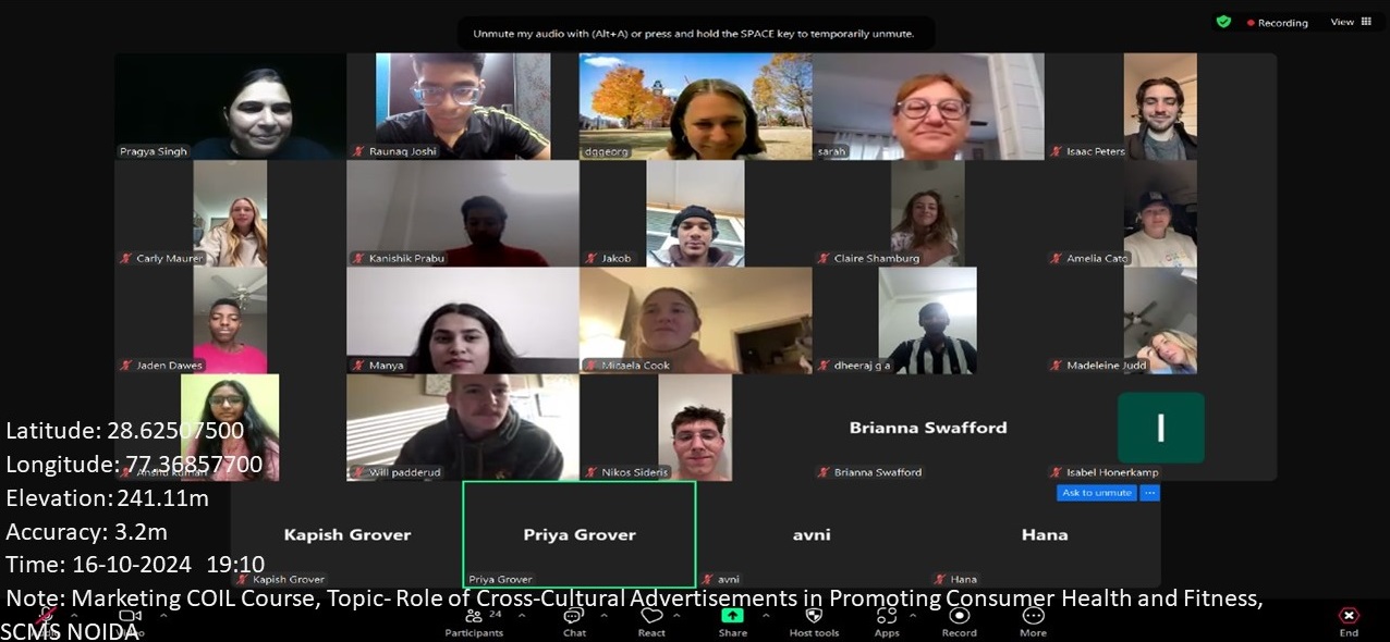 The COIL course focused on practical learning outcomes such as analyzing the effectiveness of health and fitness advertisements across cultures and understanding their impact on consumer decision-making. Students worked in diverse international teams, enhancing their skills in cross-cultural communication, digital marketing analysis, and critical thinking. Dr. Pragya, Marketing Faculty In-charge at SCMS Noida, and Dr. Sarah Jensen, Faculty In-charge at the University of Arkansas, played pivotal roles in the organization of this esteemed COIL program. Under their expert guidance, students successfully navigated the program, ensuring its smooth execution without any issues. Their leadership and support were instrumental in fostering a productive learning environment.