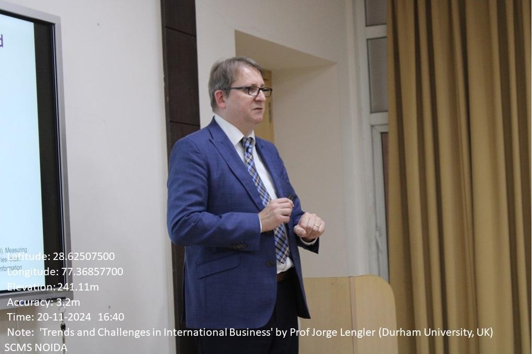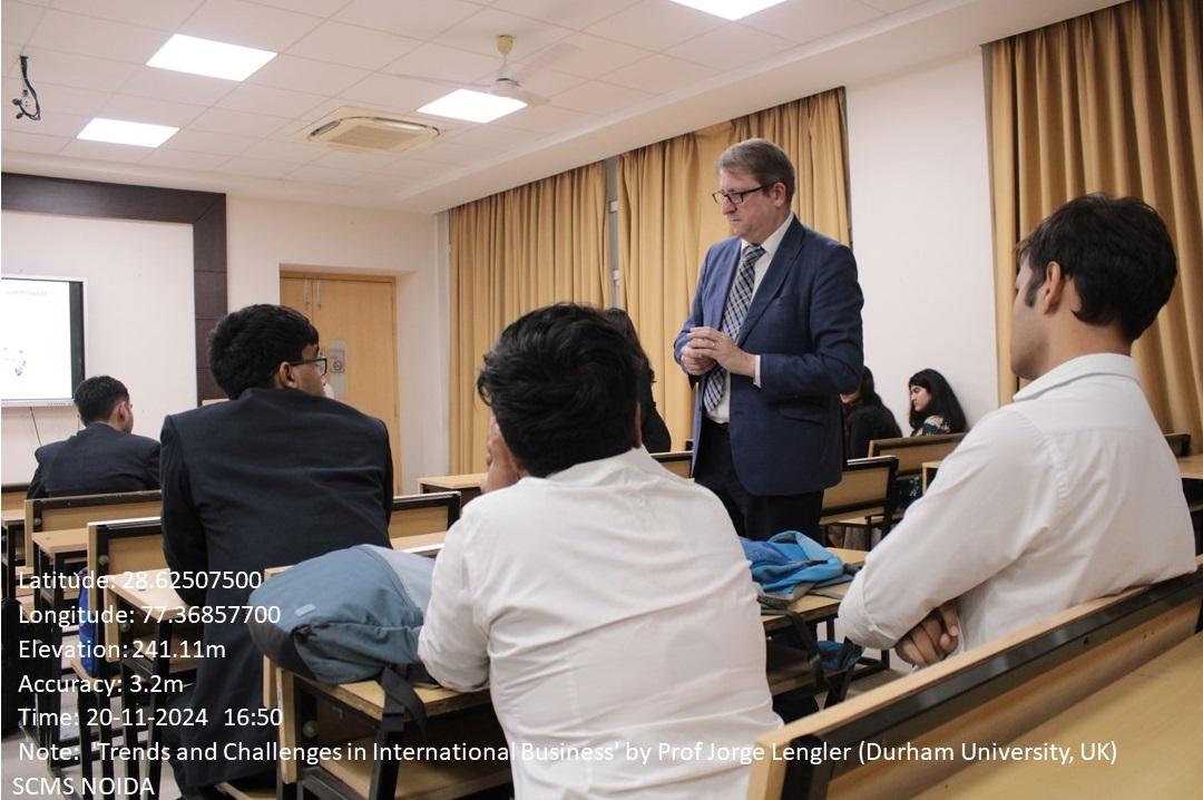 The International Cell of SCMS Noida organized a Global Talk series on the topic ‘Trends and Challenges in International Business,’ which took place on November 20th, 2024. The session was led by Professor Jorge Lengler, Professor of Management, and Associated Dean for Internationalism, Durham University Business School, United Kingdom.