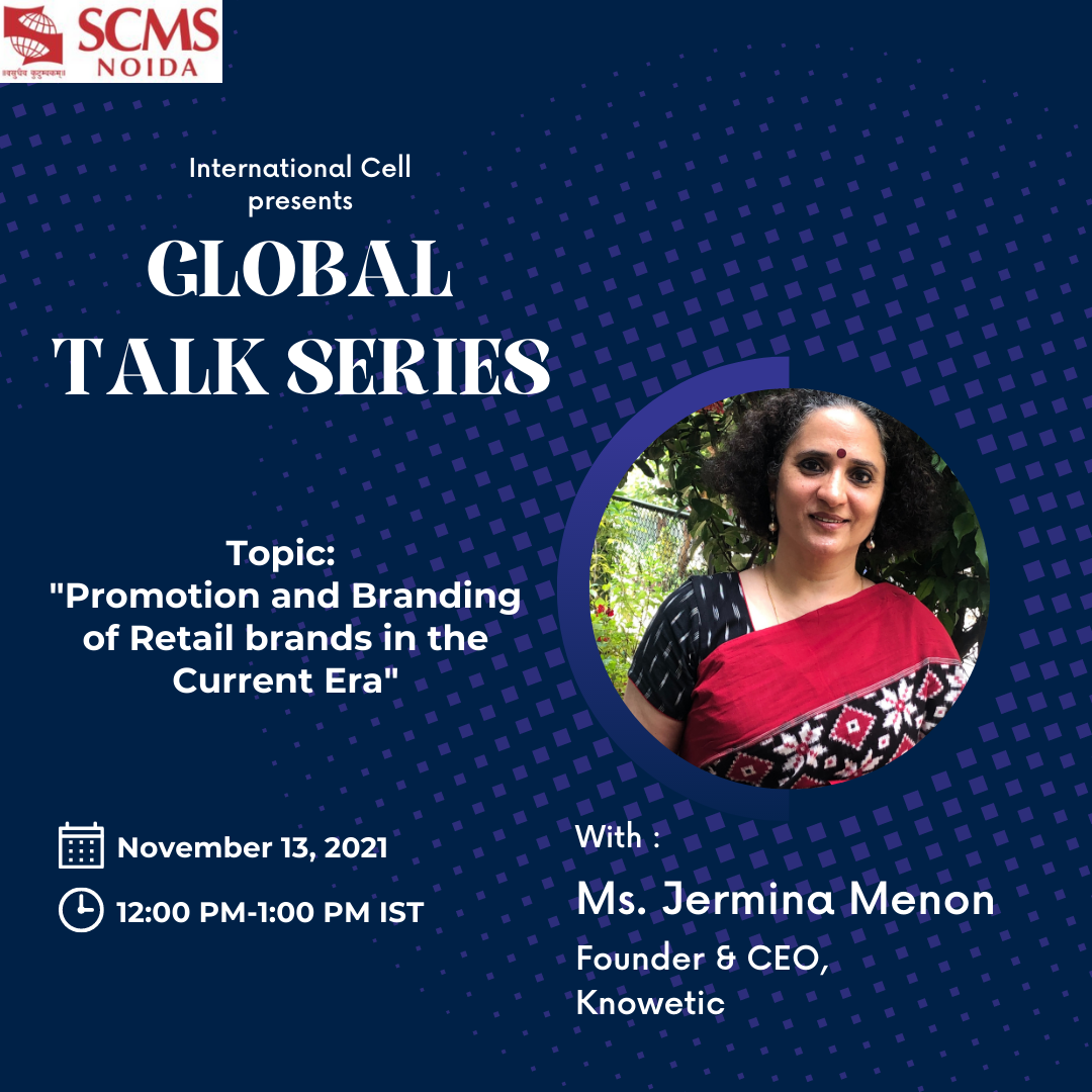 A webinar was organized under the Global Talk Series initiative by the International Cell of SCMS Noida on 4th January 2022 on the topic "Building your brand to succeed in the Corporate World". The respected speaker for this session was Mr. Pavi Gupta, the Vice President, Consumer Insights and Business Analytics, Sc Johnson, USA.