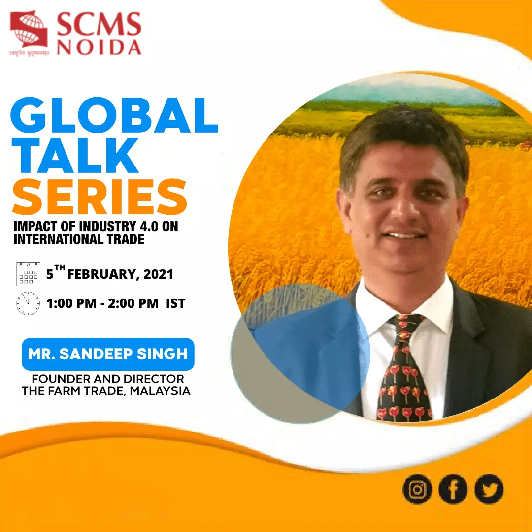 To demonstrate all the existing aspects that have an influence on the international economic ties, the International Cell of SCMS NOIDA, on 5 February 2021, effectively hosted a webinar on the topic “Industry 4.0 Impact on International Trade." Mr. Sandeep Singh, Founder, and CEO of Farm Trade, Malaysia, was the esteemed speaker. He has decades of experience in multiple regions of the Palm Oil Value Chain, like Bulk Refinery, Trading, Risk Management, Specialty Fats Marketing, Main Account Management, Sustainability Projects, Joint Venture Negotiation, and P&L Management.