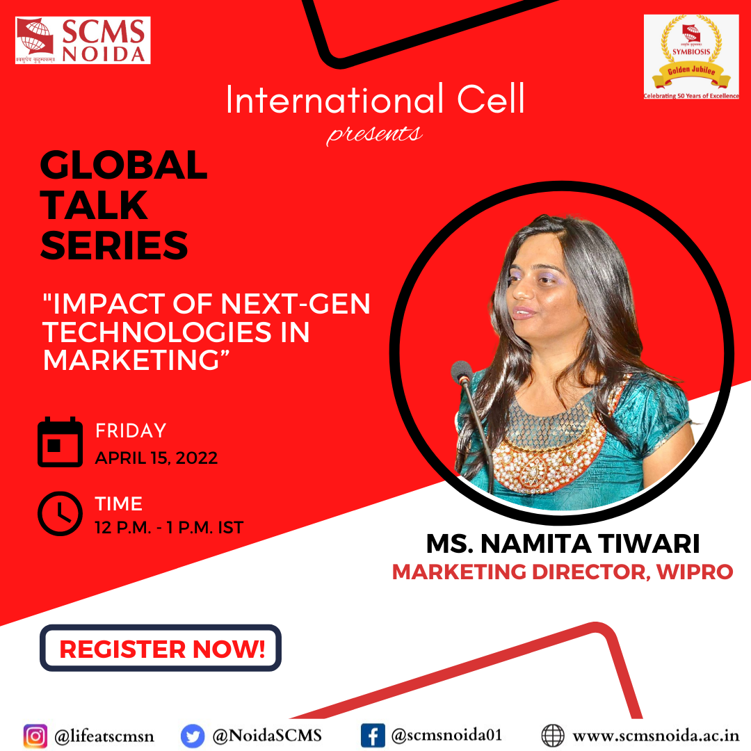 A session was organized by the International Cell of SCMS, NOIDA on the topic “Impact of Next-Gen Technologies in Marketing” on 15th April 2022 as a part of the Global Talk Series. The esteemed speaker for the session was Ms. Namita Tiwari who is currently serving as the Marketing Director at Wipro. She is a Senior Marketing Leader and Digital & Content Evangelist with rich experience in Campaigns, Content & Communications. She is passionate about creating next-generation marketing programs that converge digital, brand & content. Ms. Namita is an alumnus of Symbiosis Institute of International Business, Pune India from a batch 2000-2002, and has pursued Accelerated Marketing Leadership Program with the prestigious Kellogg School of Management.