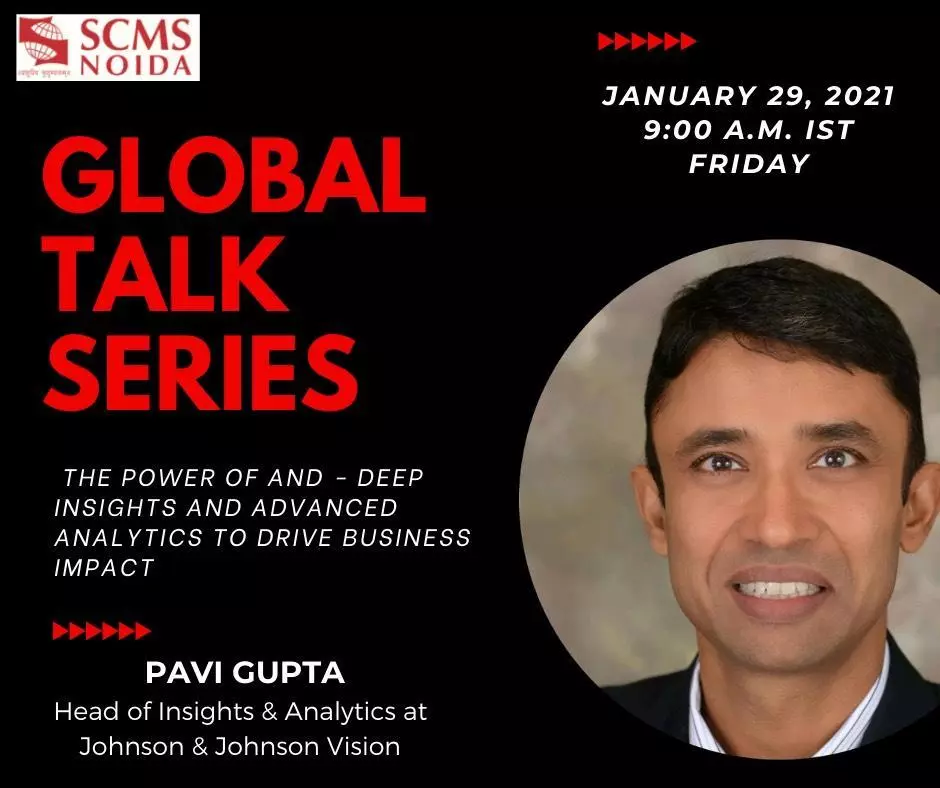 The International Cell of SCMS NOIDA organized a webinar as a part of its Global Talk Series on 29th January 2021, on the topic of The Power of AND-Deep Insights and Advanced Analytics to drive business which was attended by the students of Batch 2018-21 and 2019-22. The guest who presided over the event was Mr. Pavi Gupta who is a global functional leader holding 24 years of experience in analytics and insights of diverse companies like Coca-Cola, Johnson and Johnson, and Research International.