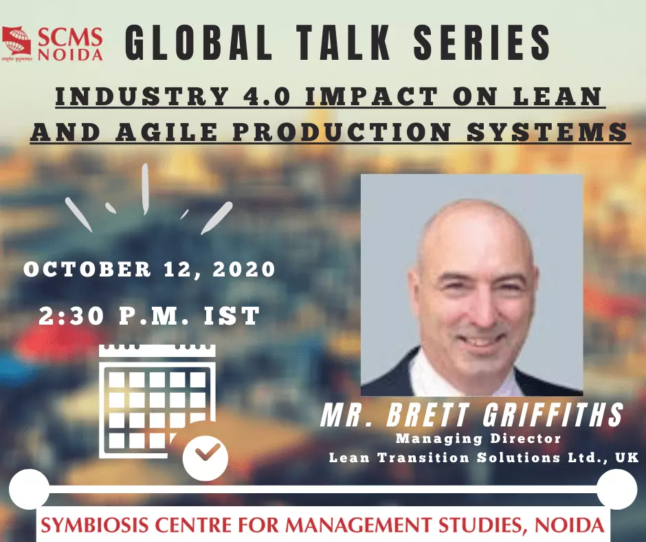 A webinar was organized by the International Cell of SCMS NOIDA on the topic of Industry 4.0 impact on the lean and agile production system, on October 12, 2020. Mr. Brett Griffiths, Managing Director of Lean Transition Solutions Ltd which is based in the United Kingdom was invited as the chair speaker. He shared his understanding and expertise with the students.