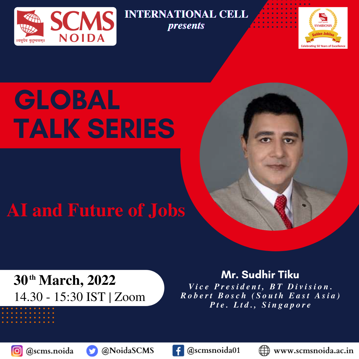 A webinar was organized by The International Cell of SCMS, NOIDA on March 30, 2022, as a part of the Global Talk Series on the topic "AI and Future of Jobs”. The esteemed speaker for the webinar was Mr Sudhir Tiku who is currently serving as the Vice President of the BT Division. Robert Bosch Pte. Ltd., Singapore. He has a keen interest in the trends in AI and the future of humanity. He theorizes that it is time to lay the ethical rules of AI engagement to ensure that ecosystems of life remain meaningful as it is affected by the advancements in AI. He has been speaking on various platforms, including TEDx, in the past.