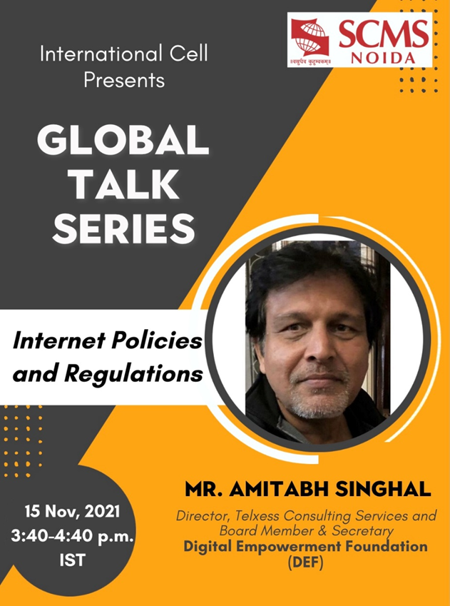 On November 15, 2021, the International Cell at SCMS Noida hosted a webinar on "Internet Policies and Regulations", as a part of the Global Talk Series. Mr. Amitabh Singhal, Director of Telxess Consulting Services and Board Member & Secretary of the Digital Empowerment Foundation, was the webinar's distinguished speaker.